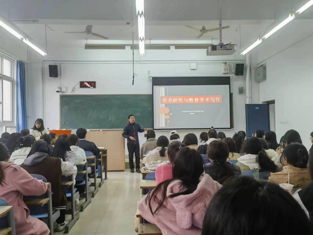 2023年11月28日下午,上海市教育科学研究院《教育发展研究》和《中国高等教育评估》杂志编辑、华东师范大学与柏林洪堡大学联合培养博士穆树航,应邀赴我院作题为“学术研究与教育学术写作”的学术报告。学术讲座在文津楼214举行,宋小香老师主持讲座,我院师生代表90余人参加了此次讲座。