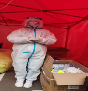 2021级学前教育专升本三班张艺博,她的家乡是郑州市巩义市,志愿服务期间,在巩义市新华路街道办事处参与了核酸检测相关工作,主要任务是辅助医务人员将采集的咽拭子放入装有试剂的管中封好并且排放整齐交给相应的负责人。她表示,为家乡贡献自己平凡而不平庸的力量,全力以赴对抗疫情!