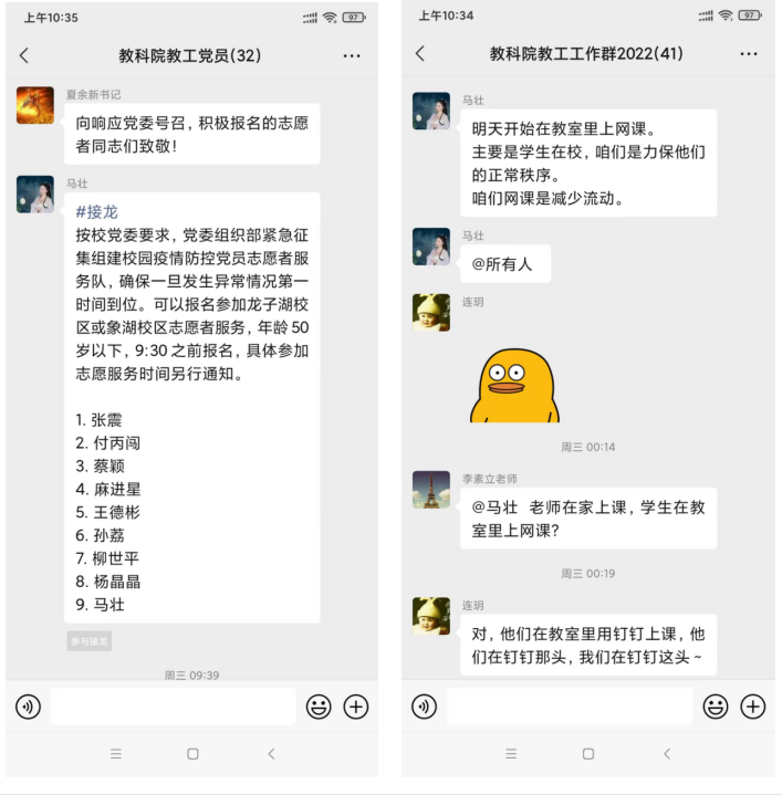 在4月28日、29日召开总支书记和院长参加的学生工作专题会议,对认识当前疫情形势、学生安全、心理健康教育、贫困学生帮扶和值班工作布置。5月3日,学院根据《关于做好当前疫情防控工作的紧急通知》和《关于启动线上教学的通知》,立即将通知精神传达至每一位任课教师和学生,对师生提出的问题进行答疑解惑,确保了线上教学的顺利开展,目前为止各项教学工作均顺利进行。5月3日晚,学校安排领导班子成员和辅导员常住学校进行值班,学院两位班子成员和三名辅导员组成应急值班队伍入住学校。5月4日,学校组织部招募志愿者,教科院党总支发出号召后,立即收到13位党员同志的报名信息,表示愿意立即投入到疫情相关志愿服务工作中,学院已经及时将第一批4名同志报名信息发送至学校组织部。同时,教科院组织学生党员、积极分子和班级学生干部、志愿者等210名成员组成的志愿服务队伍,每天上午8点至22点分时段分班次参与校园安全防卫工作。在5月4日和5日学院领导带领辅导员深入学生教室和宿舍,查看教师授课和学生学习情况,看望学生疫情防护和生活情况。