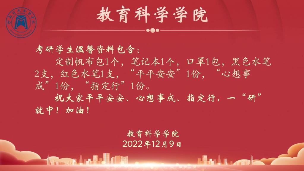 王洪成院长代表学院向同学们表达了关心和关爱,他对同学们目前的认真努力学习表示肯定,他指出目前正是考研冲刺阶段,也是疫情防控的关键时期,希望同学们放下心理负担,保持平和心态,以最佳状态走进考场、发挥最高水平、展现最棒成绩、尽显最优自我!