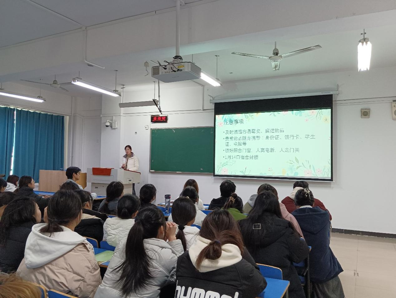 会议上,杨老师对学生进行放假前的安全教育,重点围绕人身安全和财产安全展开讲解,详细介绍了假期中各类易发生的安全问题的防范措施与应对方法。特别提醒同学们,离开宿舍时要切断电源、锁好门窗,时刻保持警惕,切实保护好自己,将安全教育真正落实到位。最后总结道:“安全无小事,无论何时何地,大家都要将安全放在首位,确保度过一个平安、愉快的假期。”同时,杨老师还预祝同学们在期末考试中取得优异成绩。同学们纷纷表示,安全是一切的基础,只有确保自身安全,才能更好地追求学业进步和个人成长。